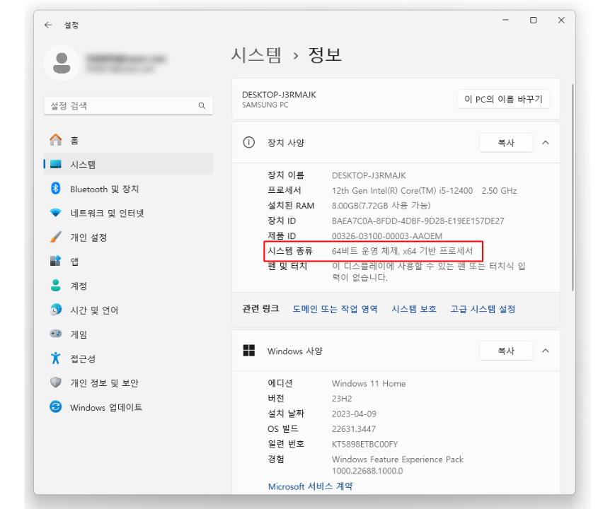 4. 장치 사양에서 시스템 종류를 보면 내 PC의 bit와 윈도우 버전을 확인할 수 있습니다.