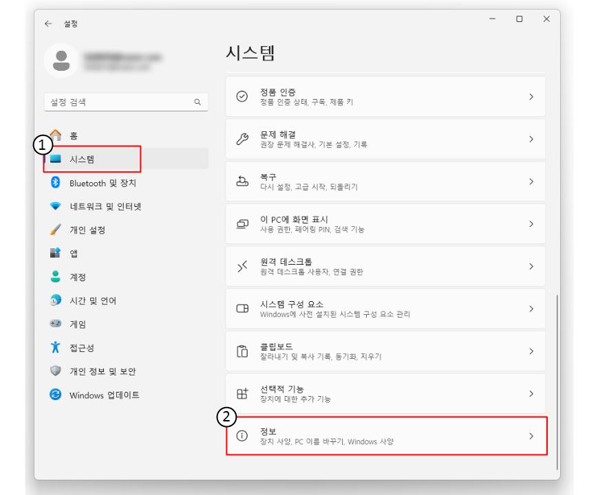 2. 좌측 두 번째 '시스템'을 클릭하고 스크롤을 가장 아래로 내려 '정보'를 클릭합니다.