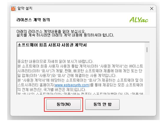 3. 라이선스 계약 동의에서 '동의(N)'를 클릭합니다.
